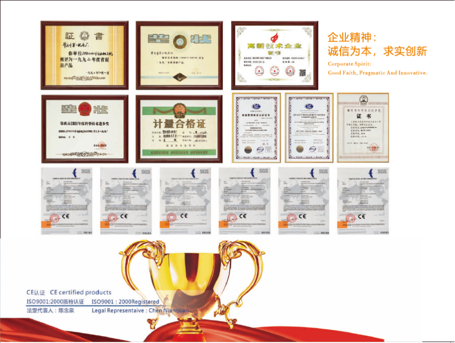 公司十分注重人才和科研?,F(xiàn)有員工230多人,其中,技術研發(fā)人員占了39人,廠房總占地面積達五萬多平方米,擁有160多臺進口的和國產(chǎn)的先進生產(chǎn)加工設備、檢測設備,包括:德國大型導軌磨床、英國滾齒機床、意大利花鍵滾齒機床、法國銑床、大型坐標式鏜床、立式加工中心、萬能工具顯微鏡、大型工具顯微鏡等。公司引進了先進的國際企業(yè)管理理念和多元化的管理模式,擁有自主進出口權,是一家集產(chǎn)品創(chuàng)新,開發(fā)、生產(chǎn),銷售于一體的高新技術企業(yè)。公司產(chǎn)品一直引領業(yè)內(nèi)創(chuàng)新潮流,并長期保持著健康、穩(wěn)定、快速的增長。公司拋光機械設備占國內(nèi)市場同類產(chǎn)品70%以上的份額,國外市場占公司總銷售額的30%。公司憑借五十多年的機械研制經(jīng)驗和精湛工藝,以及三十多年在器皿加工及拋光方面的經(jīng)驗,先后獲得多個產(chǎn)品獎項:2MB4140半自動拋光機在一九九二年榮獲肇慶市科技進步獎及廣東省優(yōu)秀新產(chǎn)品獎。多個產(chǎn)品獲得了國家發(fā)明專利權及擁有CE認證。公司已通過了ISO9001:2000質量體系認證。